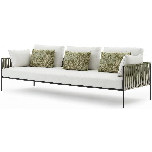 Основой служит прочный каркас из нержавеющей стали с порошковым покрытием, дополненный эластичными стропами для оптимального комфорта. Водоотталкивающие подушки с наполнителем в защитной мембране обиты тканью из перерабатываемых нитей Olyna™. Декоративное плетение выполнено двухцветными плоскими шнурами или косичками из того же износостойкого материала, подходящего для интерьера и улицы.