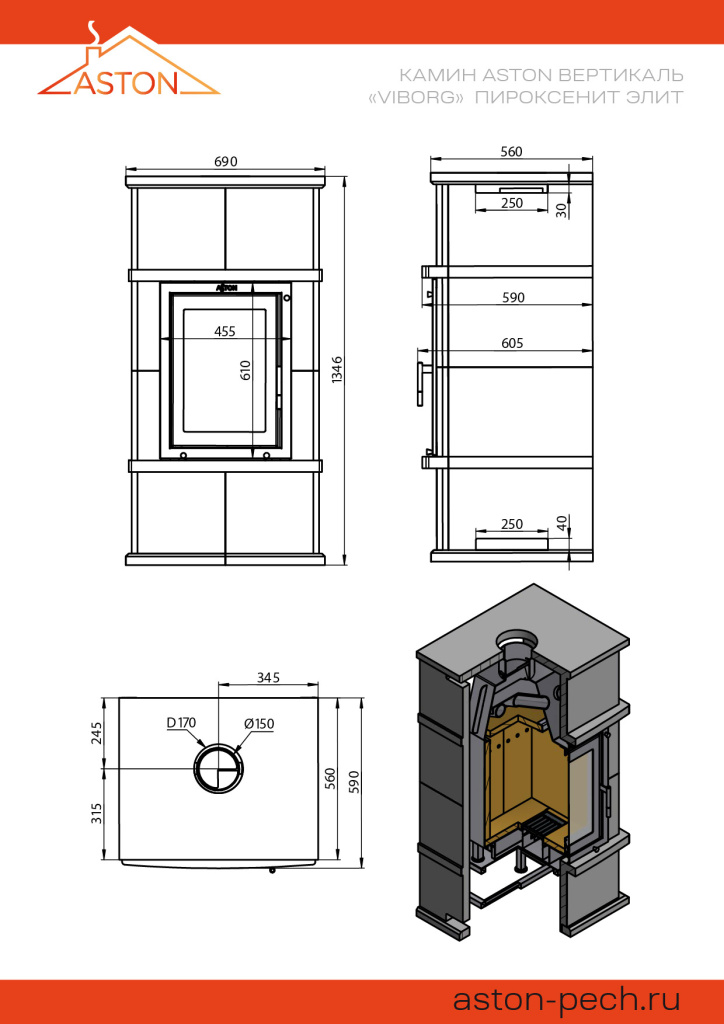 Инструкции, чертежи, документы - Готовый камин Aston Вертикаль Vyborg Н-1346 Пироксенит Элит