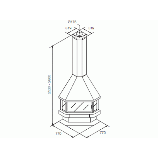 прямоугольную форму, дымоход с выходом сверху и пристенное расположение. Труба дымохода скрыта под металлическим кожухом, который завершает стильный образ