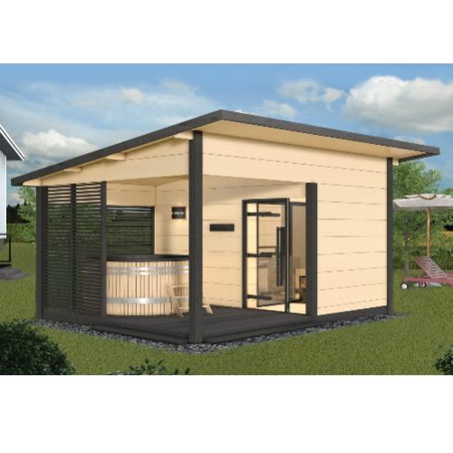 Harvia Solide Outdoor представляет собой легкую в монтаже конструкцию без фундамента и состоит из парной, помещения для переодевания и открытой террасы.