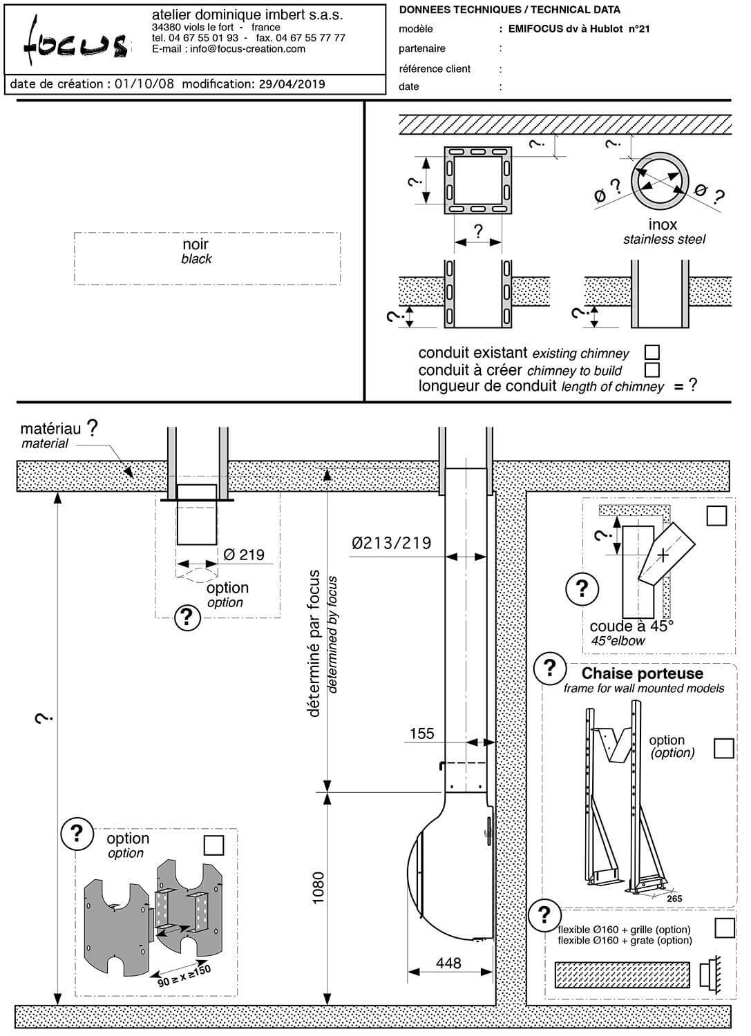 Инструкции, чертежи, документы - Готовый камин Focus Emifocus с выпуклой стеклянной дверцей, труба в потолке