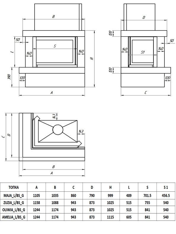 Инструкции, чертежи, документы - Каминная облицовка FireBird Ладога (для топки Oliwia/LP/BS/G) (угловое стекло слева-справа, гильотина)