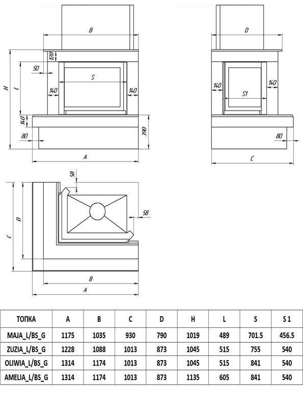 Инструкции, чертежи, документы - Каминная облицовка FireBird Онега (для топки Maja/LP/BS/G) (угловое стекло слева-справа, гильотина)