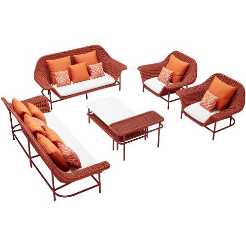Набор для террасы и сада Lisboa состоит из 3-местного дивана, 2-местного дивана, двух удобных кресел, кофейного столика и бокового столика, который при необходимости можно расположить между креслами. Кофейный столик создан из уникального сочетания материалов: алюминия и веревки, со столешницей из спеченного камня, а боковой столик имеет прозрачную стеклянную столешницу. Подушки изготовлены из прочного текстиля, идеально подходящего для уличной мебели, и наполнены быстросохнущей пеной. Применение специально разработанных материалов позволяет использовать коллекцию на открытом воздухе в полной безопасности, обеспечивая максимальную защиту от атмосферных воздействий без ущерба для эстетики и комфорта.