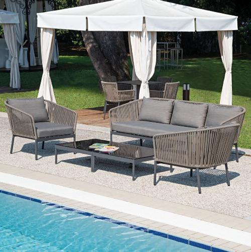 С комплектом плетеной лаунж мебели Bergen становиться возможно придать террасе или летнему кафе идеальный внешний вид и насладиться приятными моментами отдыха на свежем воздухе. В комплекте с креслами и диваном входят мягкие и удобные подушки, повышающие комфорта. Он способствует полной гармонии и умиротворению, а также станет яркой изюминкой пространства, в котором находиться, благодаря плетению из роупа.