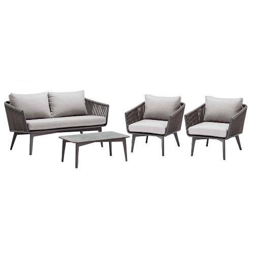 Комплект лаунж мебели Diva имеет изысканный внешний вид благодаря оплетенным корпусам дивана и кресел. Алюминиевые ножки мебели имеют конусообразную форму, что придает дизайну набора современный стиль. Благодаря красивому дизайну, прямолинейным формам и неподвластному времени цвету комплект идеально впишется в зоны отдыха летнего кафе или террасы ресторана, но также подойдет для создания лаунж зоны в саду загородного дома.