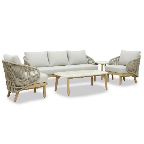 Эксклюзивная коллекция Mali приглашает вас окунуться в стиль и безмятежность на открытом воздухе. Кресла и диван, вдохновленные побережьем, имеют прочный алюминиевый каркас, оплетенный роупом, очаровательные ножки из эвкалипта и мягкие, удобные подушки, предназначенные для круглогодичного отдыха на открытом воздухе и развлечений. Кофейный столик выполнен из эвкалипта, столешница - из искусственного камня Travertine.