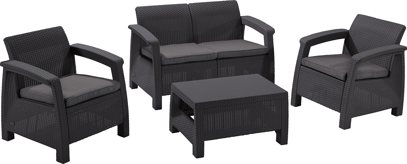 Стильный гарнитур для отдыха Corfu обеспечит своим пользователям наивысший уровень удобства. Комплект отличается современным дизайном, напоминающим натуральное ротанговое переплетение. Надежная конструкция и продуманный дизайн гарнитура обеспечивают устойчивость и оптимальный комфорт. В состав комплекта входят двухместная софа, два кресла и столик. Линия Corfu предлагается в четырёх различных цветовых вариантах, с удобными подушками (4 подушки сидений входят в комплектацию). Мебель стойкая к воздействию погодных условий и УФ-излучения.