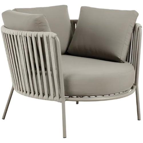 - Спинка и подлокотники оплетены синтетическим роупом - запатентованным итальянским полиолефиновым волокном для наружного применения (65% Olyna/35% Polyester). Материал обладает водонепроницаемостью, устойчив к образованию пятен, к ультрафиолетовым лучам, хлору, влажности, а также антибактериален. Материал пригоден для вторичной переработки и нетоксичен.