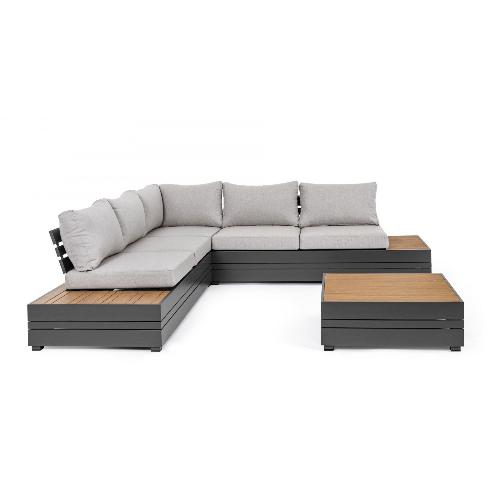 - Боковые столики на модулях и столешница кофейного столика выполнены из ДПК (композитный материал, похожий на дерево: 90% полистирол, 10% sbs) с отделкой под тик.