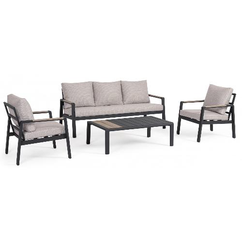 - Подлокотники и столешница журнального столика из алюминия декорированны вставками из древесно-полимерного композита.