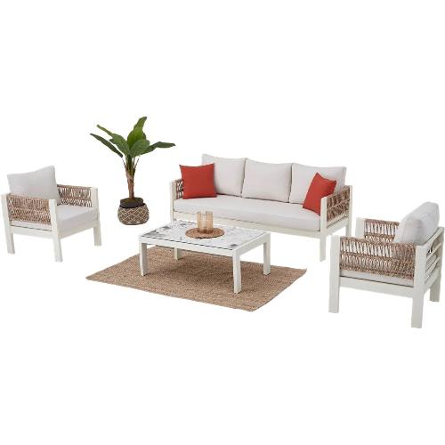 Комплект плетеной лаунж мебели Toscana – это идеальное решение для обустройства зоны отдыха как в сфере Contract, так и в частном проекте. Благодаря стильному внешнему виду и своим характеристикам комплект можно легко использовать в саду, на балконе или террасе. Благодаря алюминиевому каркасу мебель обладает прочностью и надежностью, а за счет плетения из акрила ее можно использовать на открытых пространствах, не боясь потери привлекательного внешнего вида, и с гарантированным сохранением цвета. Подушки на сиденьях дивана и кресел обеспечивают очень комфортную и удобную посадку.