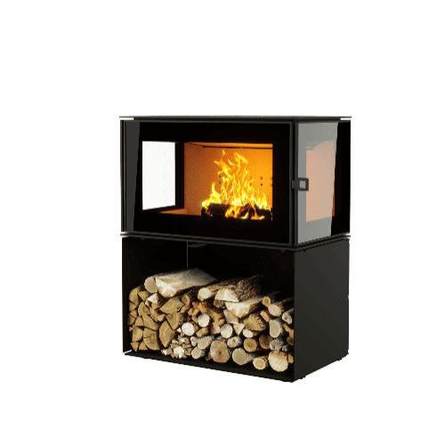 Имеется модификация с подиумом и встроенным дровником, что обеспечивает удобное хранение дров. Топочная камера облицована вермикулитом. Система вторичного дожига. Регулировка подачи воздуха и вторичного дожига осуществляется удобным рычагом. Дверь оснащена системой "чистое стекло".