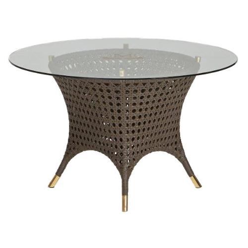 Элегантный обеденный стол Wezen с алюминиевым каркасом, оплетенным вручную искусственным ротангом, имеющим характерный узор венской соломы. Стеклянная или мраморная столешница диаметром 120 см установлена сверху. Модель отличается наличием мелких деталей, в виде ножек и элементов стеклянной опоры, выполненных с золотой отделкой.