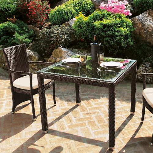 Столешница обеденного стола Palinuro толщиной 10 мм выполнена из закаленного стекла. Столешница также может быть выполнена из искусственного ротанга, лакированного закаленного стекла или из керамики с отделкой под мрамор.