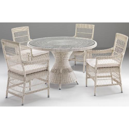 Коллекция уличной мебели Camille с алюминиевым каркасом и плетением из полиэтиленового волокна REHAU. Эти материалы идеально подходят для использования на улице, большой круглый стол диаметром 1200 мм станет элегантной частью частных и коммерческих летних площадок.