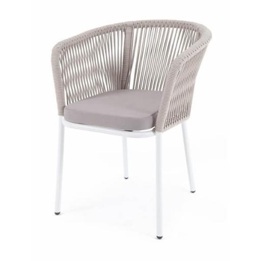 "Марсель" стул плетеный из роупа, каркас алюминий белый муар, роуп коричневый круглый, ткань бежевая 052