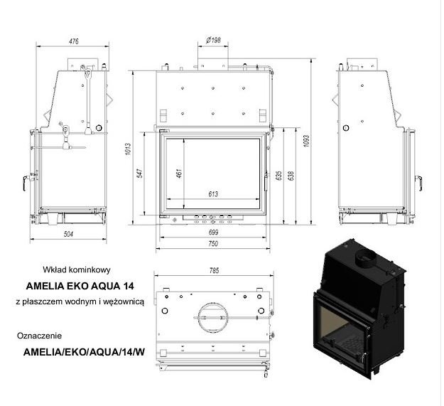 Инструкции, чертежи, документы - Каминная топка Kratki Amelia/EKO/AQUA/14/W (змеевик)