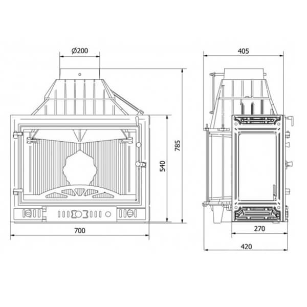 Еще одной отличительной особенностью каминных топок Kawmet является наличие встроенной шиберной заслонки с блокиратором дверцы.