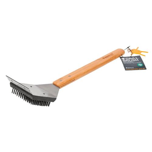 Прочная щетка из матовой нержавеющей стали с длинной бамбуковой ручкой для чистки решетки в горячем гриле. Идеально подходит для решеток из нержавеющей стали.